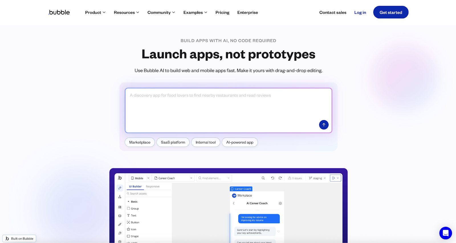 - AI-powered visual app builder with drag-and-drop interface